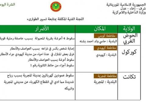 أعلنت اللجنة الفنية لمتابعة الطوارئ المتعلقة بموسم الأمطار؛ في وزارة الداخلية واللامركزية أن العواصف القوية والامطار الغزيرة التي شهدتها بعض المناطق في ولايات الحوض الغربي وكىركل وتگانت تسببت في أضرار مادية معتبرة. واوضحت اللجنة في أحدث نشرة لها…