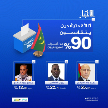 HOME NEWS ثلاثة مترشحين يتقاسمون 90% من أصوات الموريتانيين By - يونيو 30, 2024 0 127 FacebookTwitterPinterestWhatsApp