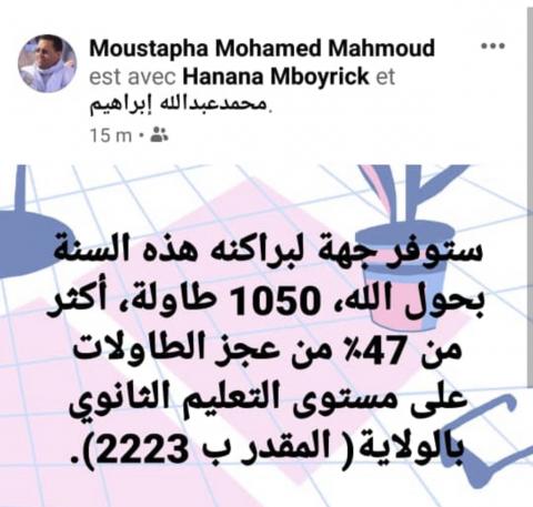 أعلن رئيس جهة لبراكنة المصطفى ولد محمد محمود، أن الجهة ستوفر، مع بداية العام الدراسي القادم 2021-2022 ما مجموعه 1050 من الطاولات الدراسية لصالح مؤسسات التعليم الثانوي في الولاية. ويمثل هذا العدد قرابة نصف احتياجات تلك المؤسسات التعليمية من الأثاث…