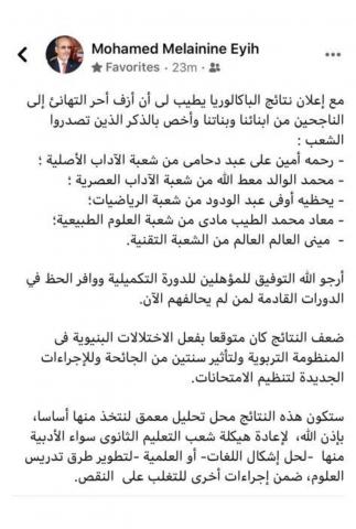 قال وزير التهذيب الوطني وإصلاح النظام التعليمي أن ضعف النتائج متوقع لضعف وتدهور المنظومة التربوية وتأثير الجائحة وأصاف أن القطاع سيحلل تلك النتائج لمعالجة هذا التدهور وقد هنأ الوزير الأوائل من كل الشعب نص التدوينة مع إعلان نتائج الباكالوريا يطيب…
